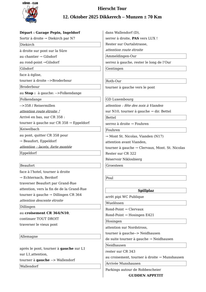 Käfer-Club Lëtzebuerg um Hierschttour Mam Käfer-Club um Hierschttour, vum Garage Pepin zu Angelduerf bis an d’Robbescheier zu Munzen, mat engem klengem Ëmwee duerch Däitschland an e groussen Toure ronderëm Veiane wou de Nëssmaart war… Fotoen (Igor Bezruchko) Fir den Tour nozefueren… Link Käfer-Club Lëtzebuerg um Spaweck Käfer-Club Lëtzebuerg um Facebook PDF vum Tour